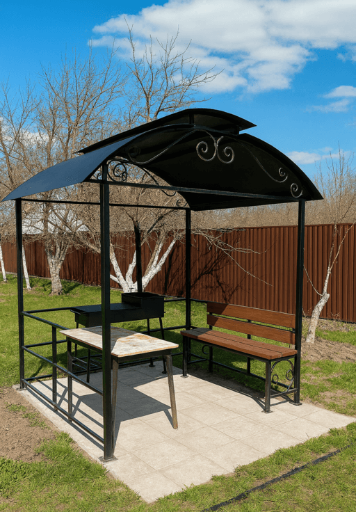 - Тип конструкции: навес над мангальной зоной может быть открытым, частично закрытым или полностью обустроенным.