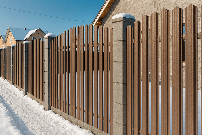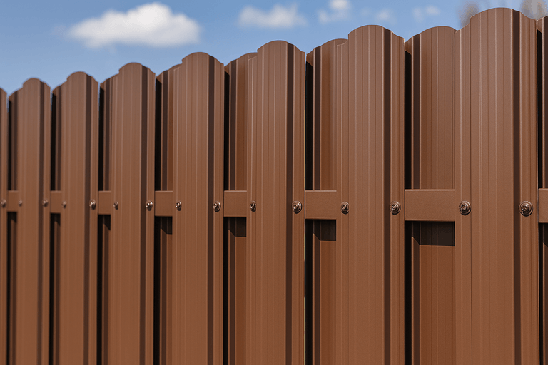 Забор из металлического штакетника — это надежное и эстетичное ограждение, подходящее как для частных домов, так и для промышленных объектов. Конструкция представляет собой набор вертикальных металлических ламелей, закрепленных на поперечные лаги, установленные на столбы.